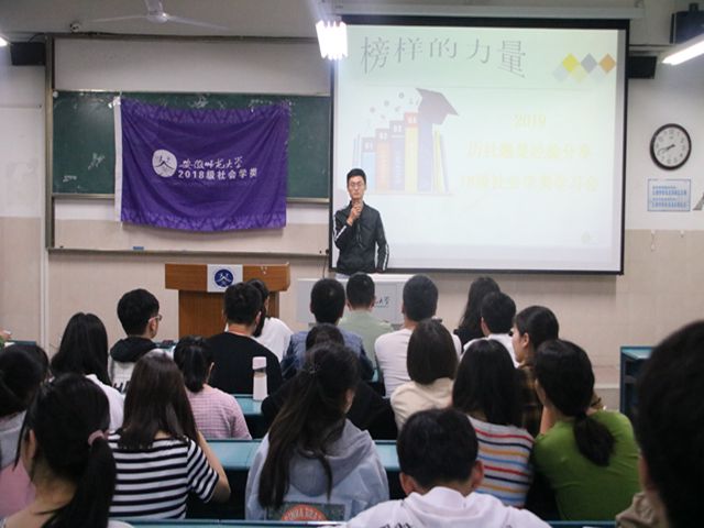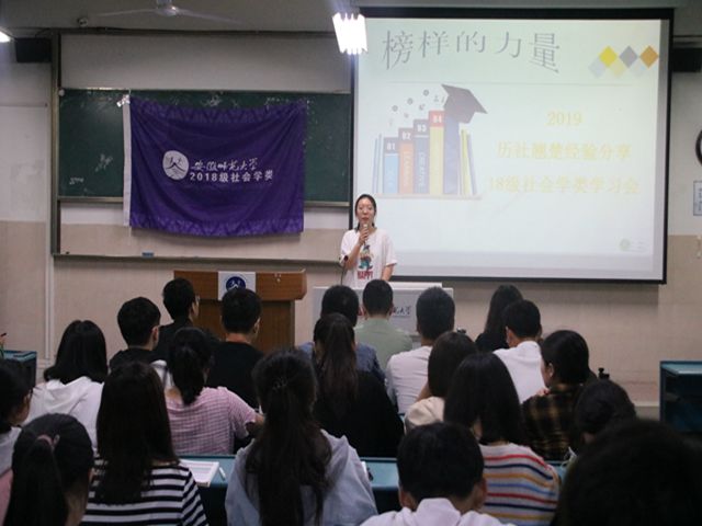 本网讯(王玲)为培养同学们以优秀学子为榜样,提高自身学习能力,2018级社会学类专业于5月15日在2050101教室开展“榜样的力量”主题班会。历社翘楚徐海峰、韦梦婷和退伍士兵施众德受邀参加,与同学们分享经验并交流。辅导员韩雪与2018级社会学类全体同学共同参与此次班会。