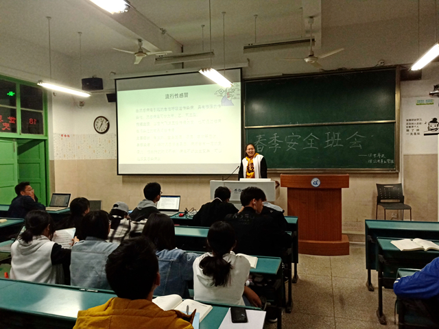 汪龙平先讲到春季容易发生的疾病以流感,结核等居多。随后讲述了不同病情的病症、病因以及对应的预防方法。针对春季的交通及宿舍安全问题,汪龙平建议大家不要晚上外出,离校时注意安全,杜绝使用违规电器。