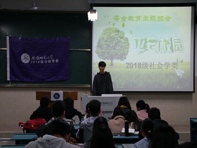 本网讯(周风)春日莺飞草长,安全牢记心中。为加强同学们的安全意识,2018级社会学类于3月19日在固定教室召开春季主题安全教育会,辅导员韩雪和2018社会学类全体同学参与本次会议。