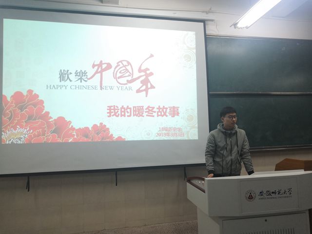 本网讯(2018级历史学 郭淑昕)为加深同学对各地年俗年味的理解,让同学在年俗中寻得历史与文化的古韵,鼓舞同学寻找、发现并关注家乡年味年俗,同时也为增进同学间的了解与友谊,3月3日晚,2018级历史学于2050102开展了“欢乐中国年——我的暖冬故事”主题班会。班会由团支书田富中主讲,历史学全员参与。