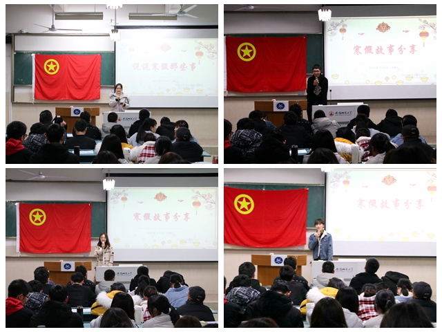 团支书朱妍首先讲述了自己的家乡安庆的民俗民风,为本次的故事会拉开序幕。而后,六个团小组一共11位同学依次上台分享了自己的暖冬故事。其中,余秋雨同学以散文的笔触娓娓道来他冬日里的几件小事。有着菜市场置办年货时被尘世的喧嚣围绕,感悟着不同于校园象牙塔中的不事生产的生活。更有在冬季的暖阳下,端个小凳子坐在院子里,享受着阳光拂过脸颊,缓缓洒落,昏昏欲睡的瞬间弥漫开幸福的喜悦。在给生活按下暂停键去体味生活和自然的余秋雨之后,李羽佳同学接着向我们分享了她和爸妈出国旅游的经历。旅途的第一站是泰国首都曼谷,大皇宫的金碧辉煌和唐人街的异域中国味都令人向往;第二站海滨小镇芭提雅的沙滩与海洋,还有世界独一无二的潜水装备和人妖产业。第三站清迈小镇的悠闲与平淡,天穹上空还有着邓丽君的歌声飘荡。