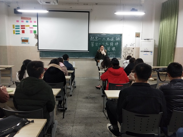 活动开始,团支书刘琼发起号召,全体起立共唱“中国共青团团歌”。之后由17社工生活委员胡磊上台给大家介绍关于“一二九”活动的背景。 九一八事变之后,日本帝国主义加紧侵略中国。他们在东北地区推行殖民地化统治的同时,利用南京国民政府的不抵抗主义,把侵略魔爪一步步伸向华北,民族危机日益严重。当日本帝国主义的魔爪伸向华北大地之时,中国共产党人向劳动大众发出抵御侵略、保卫华北的号召。1935年12月9日,北平大中员工数千人举行了抗日救国示威游行,反对华北自治,反抗日本帝国主义,要求保全中国领土的完整。这是中国共产党领导的一次大规模员工爱国运动,它大大地促进了中国人民的觉醒。北平员工的爱国行动,得到了全国员工的回应和全国人民的支持,形成了全国人民抗日民主运动的新高潮,推动了抗日民族统一战线的建立。