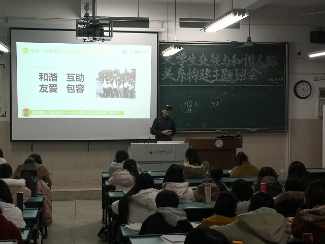 本网讯(历史学 王蓉) 为了帮助同学们构建和谐的大学人际关系,解决新生交往之间存在的问题与摩擦,宫超辅导员于12月11日晚19点在2050102教室开展了“老员工人际交往与和谐人际关系构建”主题班会。