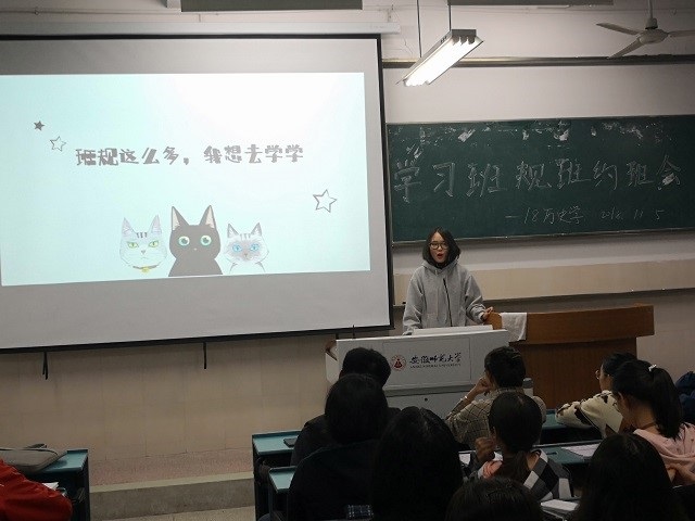(本网讯 18历史王蓉) 为了增强同学们的纪律意识,争创优秀班集体,由班长闵晨同学带领18级历史学新生于11月5日在2050102教室开展“学习班规班约活动”。