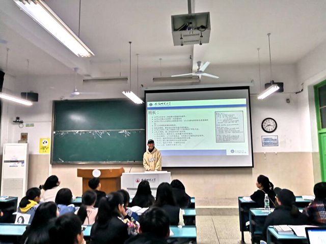 随后,班长就开学以来班级文化建设工作向全班汇报。班长通过PPT展示班徽和班旗的制定过程以及其寓意,并公布了经讨论协商所制定的班级公约及其他规章制度。接着,班长放映了近期班级开展系列活动的照片,如团日活动、趣味运动会,并表示后期仍然会开展一些活动丰富同学们的课余生活。在同学们热烈的掌声中结束了本次的工作汇报。