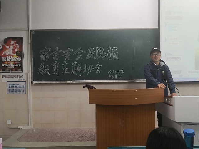 本网讯 (通讯员 王蓉)为增强老员工的安全用电、防火自救及防骗意识,11月15日下午,2018级历史学在2050505教室举行了“宿舍安全及防骗教育主题班会”,班会由辅导员宫超主讲,班级全体同学参会。
