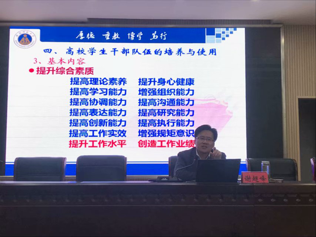 第一部分中,谢老师首先给员工干部角色定位为“特殊的员工、特殊的干部”,是老师的助手,员工的表率,师生的沟通桥梁与纽带。而后谢老师阐述员工干部的自我服务、自我教育、自我管理等职责,并分点细化的说明了为同学成人成才成功服务的基本任务。第二部分,谢老师谈及了当下员工干部面临的阶段性先冷后热、功利性评优评先、官僚化脱离同学形式主义等问题,提醒在座的员工干部进行自我审视。随后,谢老师给出了任命制、民选制等干部选拔方式,性格互补、能力互补等团队组建方法,并指出要使用科学的引导方法发挥最佳的团队效应。在第三部分,谢老师就新生员工干部团队组建展开讨论、提出来全面考察、积极引导、推荐指导、岗前培训、约法三章五大要求。第四部分高校员工干部队伍的培养与任用中,谢部长再次引用习近平讲话中给广大青年提出的爱国、励志、求真、力行的希望,强调做到严格要求、精心培养和合理使用的有机统一的基本原则。同时,谢老师提醒在座的员工干部,作为员工要以专业学习为先,再培养自身作为员工的综合能力,争做新时代全面发展的青年人才。