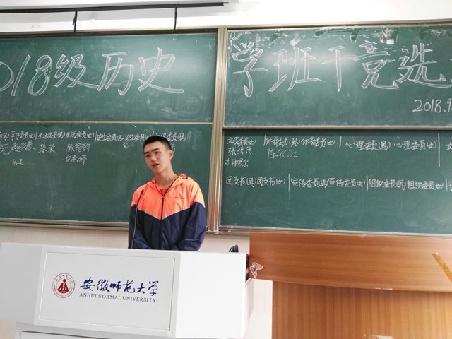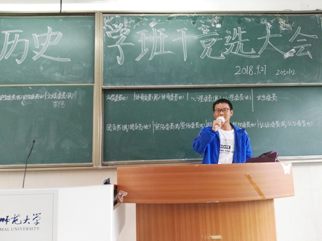 本网讯(2018级历史学)为了尽快组建班级组织,开展班级工作,9月27日上午,2018级历史学在2050502教室举行了班委竞选大会。辅导员宫超老师参加了会议。