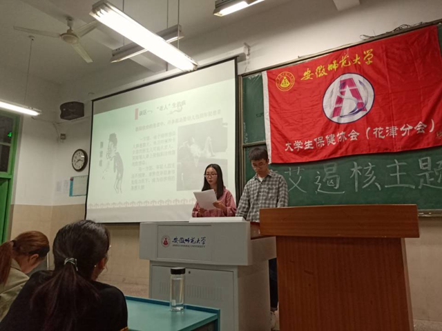 袁大亮和汪寒砚两位学姐分别从概念阐释,传播途径,预防治疗方法等三个方面对艾滋病与结核病做了基本介绍。接着,她们又向同学们展示了近年来艾滋病与结核病在全球的扩散情况,引起同学们的高度重视。为了提高同学们的积极性与活动效果,保健协会的学姐又插入了有奖问答环节,同学们踊跃参与,活动的气氛达到了高潮。