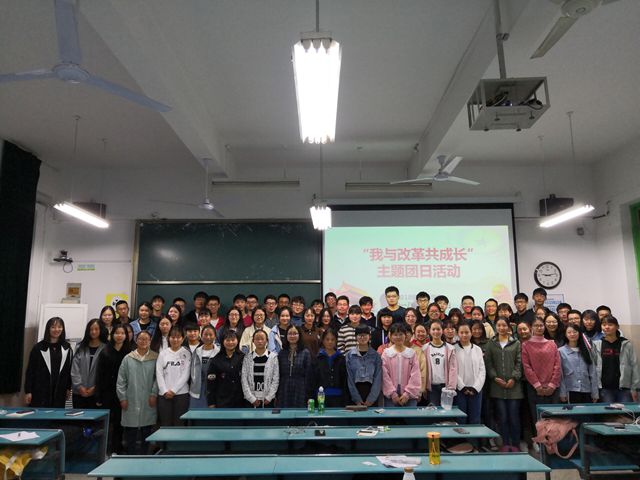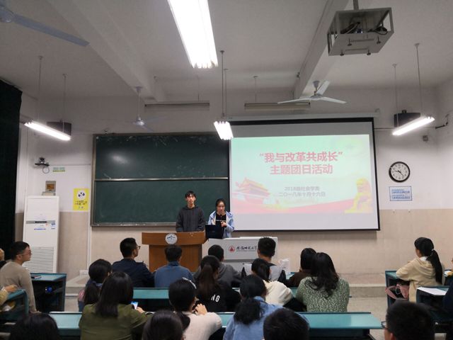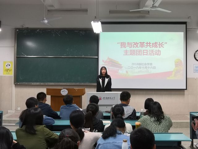(本网讯 俞孟玥 王玲)为纪念改革开放40周年,更加深入了解党的政策与精神内涵,2018级社会学类班级于10月16日晚7:00,在2050101教室开展了以“我与改革共成长”为主题团日的活动。辅导员韩雪与全体18级社会学类同学共同参与了此次活动。