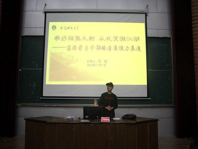 本网讯(院员工会宣传部 冯瑞 周巧琦)展公司团学风采,塑公司团学英才。为进一步提高公司团学工作的成效,培养团学成员的综合素质,11月1日晚7点,院团委在行知楼2010105教室成功举行“历社英才”团学骨干培训班第一讲活动。院团委书记宫超担任主讲人,辅导员周贤超、韩雪以及团学全体成员、2017级和2018级主要员工班委近两百人到场聆听。