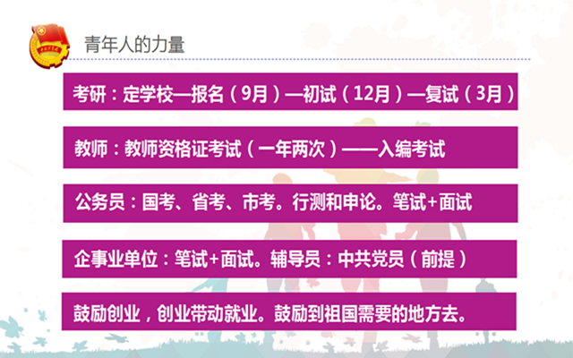 班会伊始,周老师绍了大三下学期在整个大学期间的重要性及意义,并说明了新学期的几个工作任务,包括综合测评、贫困生认定和考取资格证书等其他工作。周老师对于即将面临的就业与考研这一人生的“分岔路口”选择进行了具体分析:就业,是实现个人及社会价值的最终途径,本科毕业后如果选择就业,应当准确进行自我定位,切忌好高骛远,眼高手低;考研,是获得更高学位的必经之路,虽然路途艰苦,但却是一个重新选择学习方向的机会,更有助于同学们聆听心声,坚定心中的未来道路,同时考研学习也有利于同学们进一步培养上下求索、寻知求学的进取精神。