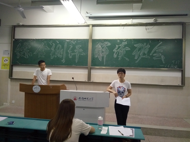 班会伊始,杨老师首先从评分标准、评分等级、量化考核的内容以及测评小组人员的组成等各个方面向同学们介绍了今年综合素质测评新的变化。接着,团支书薛世民依次详细介绍了基础素质测评、智育素质测评、发展素质测评三个模块具体及个性化的测评细则。最后,在全班范围内征询了全体同学的意见和建议。综合测评工作事关同学们切身利益,也是衡量和考验能否公平、公正、公开的处理班级事务,因此,16历史在综合测评的每一个环节都充分进行民主讨论、班级公示,让同学们有充分的知情权和参与度。在班会最后,杨静老师结合班级考研与就业意向调查表就同学们即将面临的人生道路进行了说明,细致为同学们分析考研与就业的趋势与利弊,并鼓励立志考研的同学要坚定信心,就业的同学要把握机遇。针对同学们对于考研和就业的颇多困惑,杨老师表示即将组织班级专题讲座为同学们进行解疑答惑。