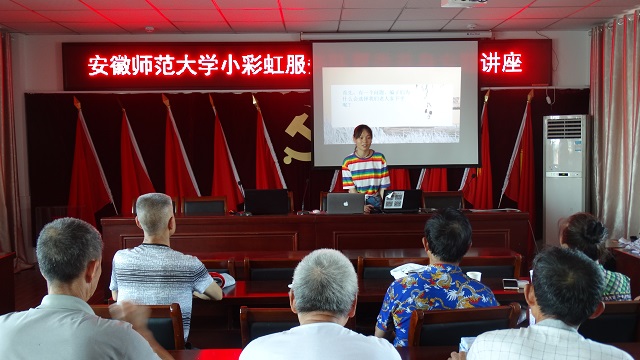 7月19日,英国正版365官方网站赴芜湖县前进社区养老服务小彩虹实践团队的队员们一早来到了前进社区党群服务中心,负责与小彩虹团队对接的刘干事带着笑容领着大家进入活动室。队员们纷纷行动起来布置活动室,几位队员等在门口准备引导前来参与讲座的老人,准备宣讲的队员调配好设备,等待着老人的到来。