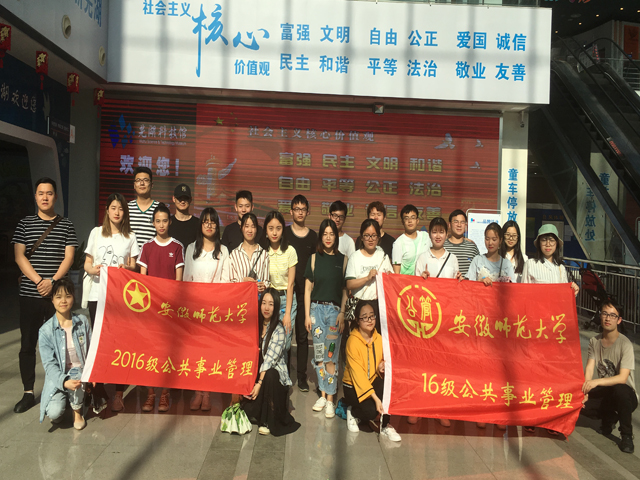 本网讯(2016级公共事业管理 崔哲明)5月9日,2016级公管班在辅导员周贤超的带领下前往芜湖市科技馆开展主题团日活动。此行旨在让同学们了解科技发展情况,加深对现代文明的印象,深刻理解国家“科学技术是国家第一生产力”的重要方针,探求中国的科技梦,更加明白青年的责任担当。