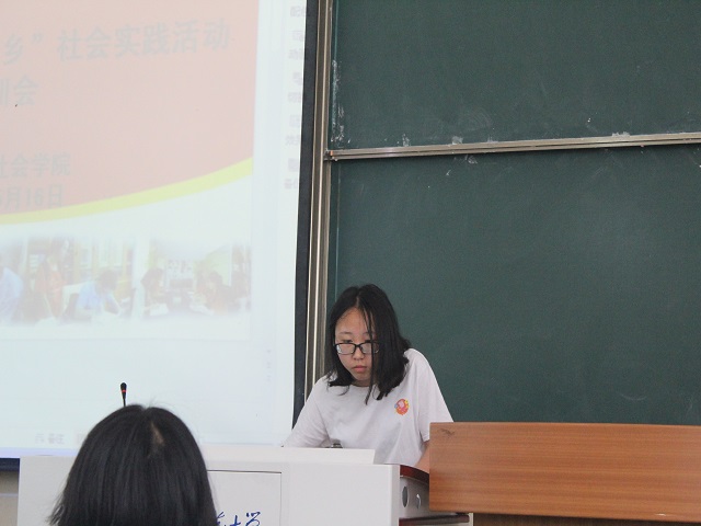 为提升暑期社会实践的水平,会议还邀请上届校级重点团队两名队长杨文俊和别娟分别介绍自己参与社会实践的经验。杨文俊以调研类为例,分别从实践前,实践时和实践结束后,介绍各个阶段团队所需要做的工作。实践前立意课题非常重要,同时也要与指导老师多多交流,老师可以给团队整体方面提出切实的帮助;实践中,团队要相互鼓励,实践报道多写多投,每日总结,弥补不足;实践结束后,撰写调研报告,整理材料,参加评比。而别娟则侧重于支教类实践的经验分享。她着重强调的即是时间前期工作。重点提及宣传工作和安全问题,宣传工作一定要做好做大,要让他人知道整个团队的所作所为及实践意义,在群众中有一定的影响力,号召更多的人参与支教服务中,让更多的大山孩子学到知识,看见外面的世界有多么绚丽灿烂。同时安全意识也应该牢记每个人心中。两位学姐的优秀事迹也为今年参与暑期社会实践的同学提供借鉴和榜样,为接下来的社会实践开展奠定坚实基础。