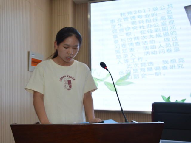 在主持人热情洋溢的开场白中,大会拉开了序幕。此次大会有三项纪要,第一项,主持人介绍与会评委,并宣读本次换届大会的注意事项,大会按照赭山史学社,海星调查研究社,公共关系协会,社会工作关系协会的顺序进行,选手在规定时间内依次汇报,评委进行相关评分。第二项,各竞选选手按顺序依次进行竞选汇报,他们各自介绍自己的基本情况,工作回顾,工作预期及未来展望,对自己过去一年在社团的工作和成长进行总结,根据自身能力与专长,对未来社团的进程进行规划和预期,对当前社团存在的问题指正并提出解决办法,为社团前景和发展献计献策。竞选选手的发言汇报,精彩表现得到老师和同学们的热烈掌声。第三项,宫超老师上台发言。老师分别从社团会长及副会长的重要性,选手汇报思路及如何开展好社团工作三个方面为同学们提出建议。社团是员工自发组织,自负盈亏的员工组织,其性质决定老师对于社团的干涉和交流会相对较少,所以更加体现会长和副会长的重要性。社团跑得快,全靠会长带。会长需要善于自我提升,善于对外沟通交流,善于组织团结社员理事们。老师提出,希望会长和副会长肩负起自己的责任,带领社团一路向上。在最后,所有与会人员一同合影留念,换届大会圆满结束。