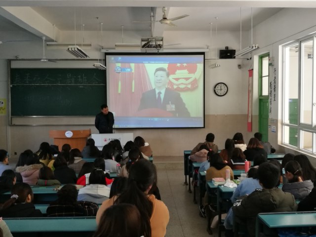 最后,辅导员还向同学们宣传了与大家息息相关的“两会”热点话题,希望大家积极关注时政热点,深入地理解“两会”内容和“两会”精神。在班会进入尾声时,辅导员还播放了习近平总书记进行宪法宣誓的视频,庄严的仪式和传达的新时代新面貌的精气神令大家振奋人心!