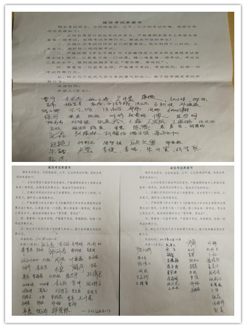 诚信考试,从我做起。周老师对大家从未出现作弊现象提出表扬,并希望大家继续保持良好的考试作风。为进一步巩固诚信考试的意识,周老师带领大家重温了《员工手册》中的关于考试违纪的处理内容。大家也在诚信考试承诺书上郑重签下自己的名字。