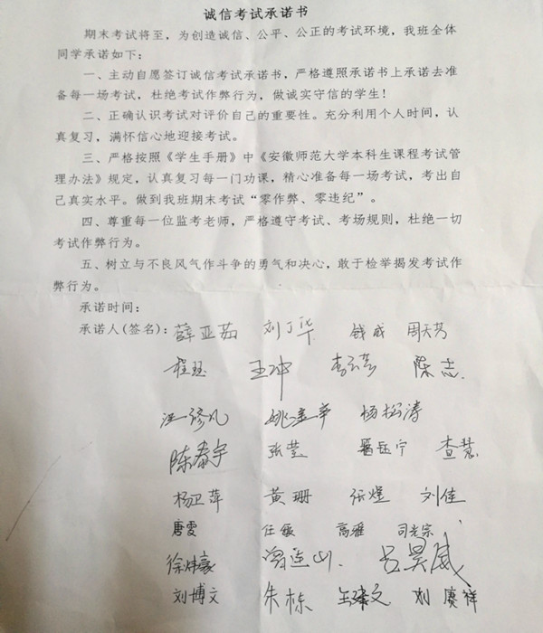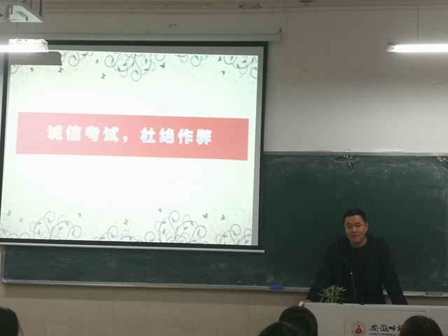 首先,周老师由即将到来的期末考试展开讲话。列举了一些考试作弊的例子,强调了考试作弊对员工个人的不良影响,突出了诚信考试的重要性。并引用了“人无信不立”论述了诚信品质对个人的重要性。同学们在诚信考试承诺书上郑重的签下了自己的名字。接着周老师讲到了期末考试成绩对个人的影响之大,鼓励同学们加紧复习,努力考出好成绩。其次,周老师还提及了转专业考试的事情,他举例说明了社会学专业的优势,也告知有意愿的同学可以选择尝试。并且,周老师特别叮嘱宿舍安全卫生工作,希望大家务必保持良好的宿舍环境,并杜绝晚归不归现象。在班会即将结束的时候,周老师对班上认真努力的同学给予了肯定,同时也提出来了一些共性问题,希望同学们给予改正,在新的一年里继续努力!