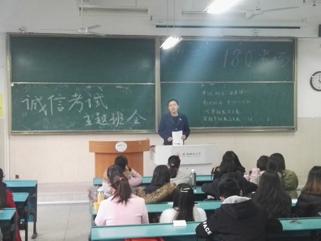 (本网讯 杨玉城) 为能更好地调动员工期末复习热情,营造诚信自律的考试氛围,树立优良学风,2017年12月21日、26日,2015级各班在2050101、2040101A、2010305、2010502分别召开诚信考试主题班会。主题班会由2015级辅导员金捷老师主持,各班全体同学参加了主题班会。