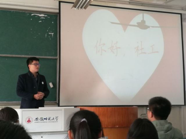 然后,社会工作者们代表自己所属的社工组织依次向大家介绍了自己的团队状况,介绍内容包括了团队理念、团队规模、服务领域等。第一位老师的讲解尤其令人印象深刻,她的名字叫孙林林。她以自身为模板,给大家分享了属于她的十年社工经历。从一开始因为被调剂到社会工作专业的迷茫,到只身远赴深圳实习的勇敢,再回到苏州在社工管理中不断地锤炼自己,最后以两家社工机构的创始人、苏州社会工作者协会的主干事并兼任其他职务的优秀社工的姿态站大家面前,用事实说话,向大家展示了社会工作者的决心和毅力,并且也证明了社会工作的前景是广阔的。她说:“社会工作不只是一项工作,更是一种事业。”从她的精神气质中大家能清晰地感受到她真的在为社会工作这项事业不断拼搏与奉献。不仅仅是她,所有来到安师大的社会工作者们他们的脸上总是洋溢着笑容,在介绍自己是社会工作者时底气十足,这是因为“助人自助”而发自内心的自豪。