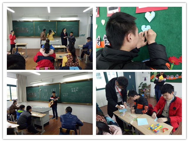 下着小雨的初冬清晨,志愿者们按时抵达了芜湖市培智公司,再次和孩子们见面,大家都很兴奋。首先第二团小组组长苏子浩同学和孩子们打招呼,提醒大家降温适当添衣。接着,志愿者拿出提前准备好的彩色纸片,和孩子们做起手工。采用一对一的教学方式,孩子们成功折叠出“小爱心”、“小青蛙”,在志愿者的引导下,孩子们在爱心纸片上写上“爸爸妈妈我爱你们”的字样。另一边,夏军涛同学拿出吉他在教室弹唱起来,和孩子们积极互动,一唱一和,悠扬愉快的歌声在走廊间回荡。休息之余,志愿者们和孩子们玩起了“你画我猜”的小游戏,拿出点心和糖果发放给孩子们,教室里洋溢着一片欢声笑语。最后,志愿者和孩子们合照留影,与他们挥手道别。
