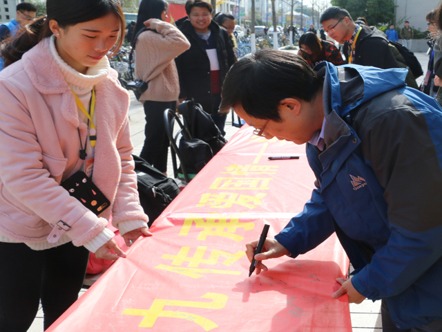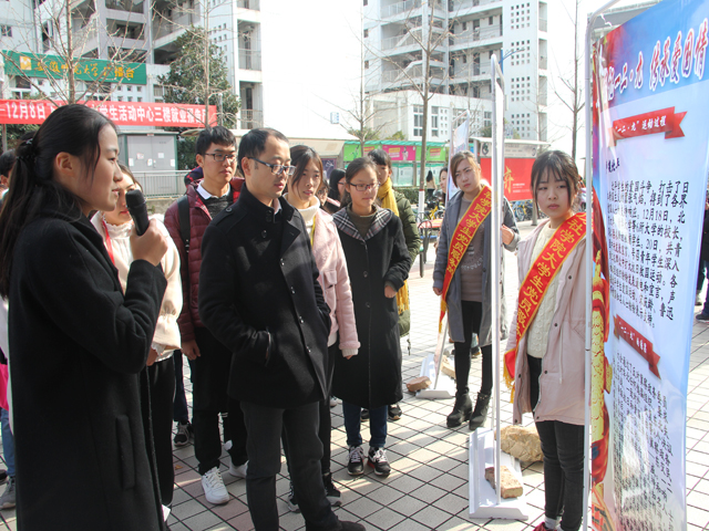 12月8日中午,院团委在二食堂门口举行了“纪念'一二·九’运动82周年”主题宣讲活动,讲解员主要从背景、过程、结果、意义及运动中杰出领袖来为大家讲解了“一二·九运动”,既提醒同学们要铭记国家历史,不忘历史的屈辱,又告诫我们当代老员工要要运用自己的知识来振兴中华,使祖国强大起来,勇担时代使命。同学们通过在横幅上签名和聆听讲解员宣讲,来缅怀那个激情燃烧的革命岁月。一幅幅精心制作的展板,一句句激情澎湃的宣讲,让许多师生久久驻足。