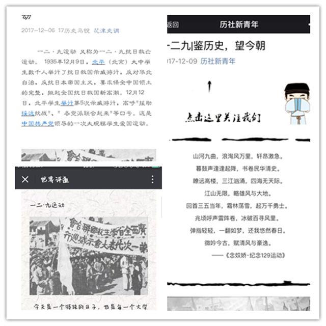 在开展活动的同时,院团委充分利用院团委、员工会和各班的线上宣传平台,在微博、QQ等同学们喜闻乐见的新媒体平台上互动交流,做到及时更新,宣传“一二·九运动”。同学们纷纷点赞转发,借助线上平台的快速与便捷,让更多的人投入到爱国的实践中去,弘扬以爱国主义为核心的中华民族精神。