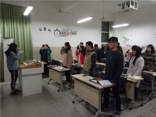 班会伊始,张苑同学向同学们简单介绍了“一二·九”运动的背景以及发生过程让同学们重温了那段抗战动员的历史。班级团员也纷纷发言,表达了自己的爱国情怀和为努力学习的信心和决心,并表示要模范遵守校院的各项规章制度,积极进取,以此告慰为新中国成立而抛头颅、酒热血的先烈们。接着,以团小组为单位,共分为五组展开朗诵比赛。朗诵活动氛围活跃,大家饱含热情的朗诵,抒发出对先烈们的敬仰与怀念之情。在此次朗诵活动中,大家通过团体合作,增进了彼此之间的感情,还了解了“一二九”运动的历史,每个人都有所收获。最后,全体起立,在团支书张苑同学的带领下一起宣誓:铭记历史,勿忘国耻;热爱祖国,服务人民;勇于拼搏,积极创新;谨记校训,奋发图强。共创辉煌。