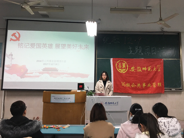 本网讯(2016级公共事业管理 崔哲明)为了纪念一二·九运动82周年,同时增进同学们对一二·九员工爱国运动史情的了解,增强其民族复兴使命感,12月8日下午4点,16级公管班在行知楼2030201教室举办了纪念“一二·九”知识竞赛活动。此次活动由团支书朱慧主持,16级公管班全体同学参加。