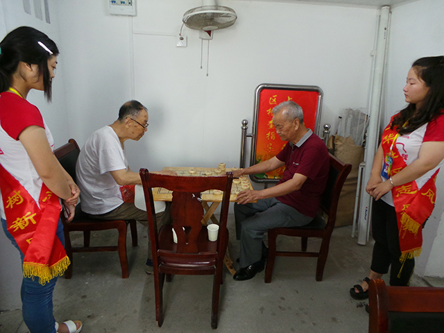 早上七点半,队员们已来到公园进行晨练。早上八点多,分队队员们早早来到五华社区老年人活动中心布置会场。上午九点多,事先得知消息的爷爷们早早来到活动中心,在我们的宣传海报上签名后进入场地等待。队员们按事先分配好的工作,2人在门外迎宾,1人填写奖状,1人拍照,余下的人充当每桌的裁判。其中有一位爷爷在得知我们在这举办活动有奖品后,马上回去召唤他的同伴。九点半,象棋大赛正式开始,队员们兼职服务员,热情地为爷爷们端来热水。由于一位爷爷暂无伙伴,为缓解爷爷的寂寞,我们的队员也上场与爷爷下了两场,爷爷棋艺高超,赢得两连胜。赛场上,爷爷们时而凝眉苦思,时而恬然微笑,时而酣畅大喊“将军”,全身心地投入到这场象棋比赛中,都顾不上喝水。十一点,经过几轮激烈角逐,最终冠军诞生,一共有7位老人获奖,由我们给爷爷们颁发奖状及相应奖品,活动结束后由社区工作人员给我们合影留念,五华社区象棋比赛圆满完成。接下来,队员们又马不停蹄地赶赴芝山社区探访下午健康知识宣讲的活动场地。