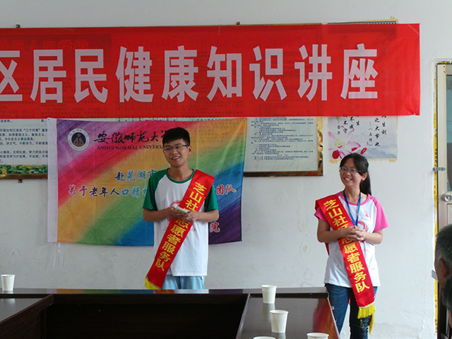 下午两点半,分队全体成员集合,提前前往芝山社区居委会会议室布置场地,队员们挂起队旗,拉起横幅,摆好桌椅,静等爷爷奶奶们的到来。三点半,爷爷奶奶们相继到场,由热情的队员的给他们引座、端茶倒水。一切就绪,我们的队员们上台向老人们宣讲健康知识并和爷爷奶奶们积极互动,提出一些养生方面的问题,在用无为方言沟通后,爷爷奶奶们回答了我们的问题,队员们发给了奖品。四点二十,健康知识宣讲活动进入尾声,队员们对爷爷奶奶们的到来表示感谢,衷心祝愿爷爷奶奶们身体健康、身心愉悦、阖家幸福。最后由队员们给爷爷奶奶们送上活动小礼品,全体成员与居委会文明创建的周主任合影留念。