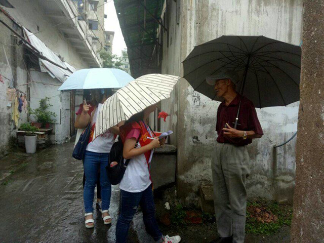 下午,团队一行10人在五华社区居委会与社区工作人员交流下午的工作情况。社区工作人员为我们提供了志愿者服务绶带,并向社区孤寡老人的信息。我们10人分成两队:一队去走访孤寡老人,开展志愿服务;一队在社区小巷与老人进行问卷调查。
