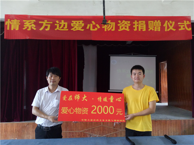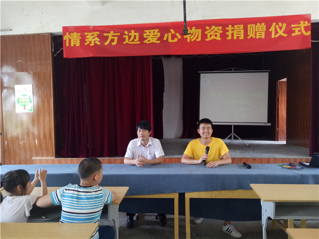 首先,团队队长司海峰向希望小学的老师和孩子们表达了团队能来到小学支教的欣喜,方边希望小学的王董事长也对团队成员们表示了欢迎,在孩子们热烈的掌声中,队长司海峰代表团队向希望小学捐赠了志愿者们为其募捐的2000元物资,希望能尽志愿者们的微薄之力,给孩子们带来精神上的鼓励与支持。