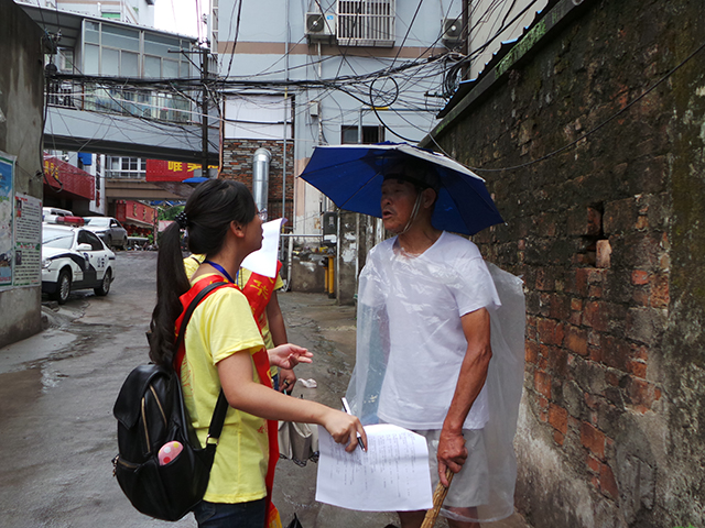 下午淅淅沥沥的小雨停下,小彩虹队员前往五华社区开展问卷调查实践活动。队员每2人分成一组,走街串巷问询老年人精神文化需求。队员们带好调查问卷、笔和志愿者绶带,向各街道上的老人问询。雨刚刚停,初始街上的行人不多,随后因为空气清新,被上午的雨阻碍了活动的市民纷纷走出家门,队员们抓住难得的机会,与出来活动的老人交流。老人们对我们的实践活动都表示理解和支持,一位老人说道:“我的孙子孙女跟你们一样大,也是老员工,你们在外搞暑期社会实践挺不容易的,爷爷和奶奶都是明白的。”于是喊出老伴也给我们做了问卷。由于遇到很多老人不识字或视力不行,队员们选择采用口头复述的方式配合完成调查问卷。每当遇到老人们向我们一行志愿者投来疑惑的目光,我们队员便会礼貌地主动向他们解释,直到他们露出明白的神情。每当这时,我们便深深感受到了师老员工身份的民间口碑很好。有时候,我们会遇到一大群特别热心的爷爷奶奶们,一下子便完成了好几份调查问卷。也有正在忙碌的爷爷奶奶停下手边的活,特别仔细聆听我们的问卷,对我们的问卷调查十分认真,显然对我们的工作十分认可。