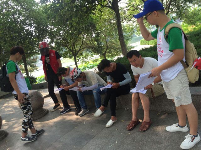 团队分成两组,一组在文峰公园附近随机抽取路人填写问卷调查,一组在阜阳一中和阜阳师范公司附近寻找热心员工和老师填写问卷调查。问卷的主要内容是通过群体样本对城市精神文明的了解和对阜阳市历史遗留文物的了解程度分析阜阳市的历史遗留文化对其现代城市建设的作用。