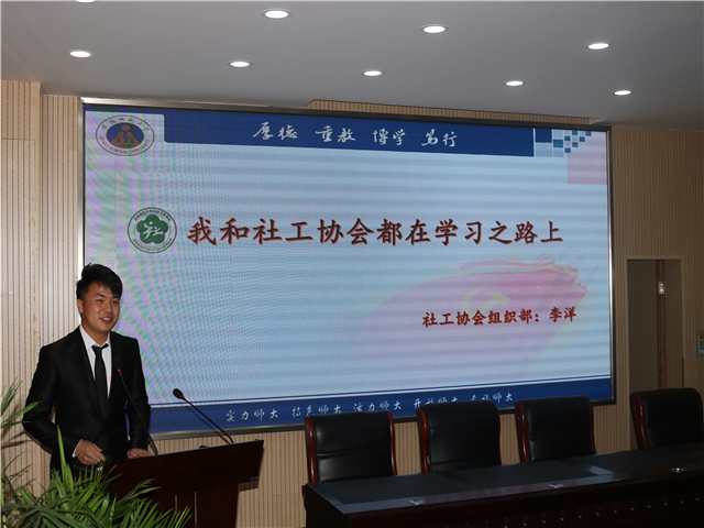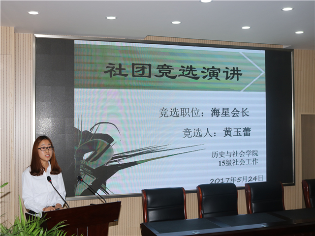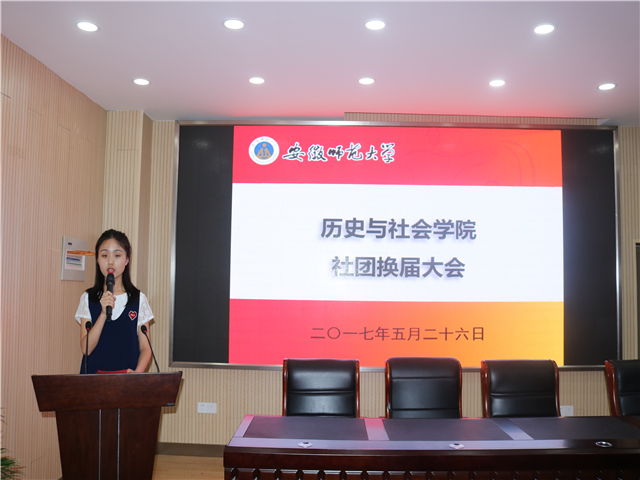 大会在主持人热情饱满的开场白下拉开序幕,大会共有三项议程。第一项,由主持人宣读换届大会的注意事项:大会按照赭山史学社、公共关系协会、海星调查研究社、社会工作关系协会的顺序进行换届竞选。每位竞选选手将依次进行汇报,然后回答评委老师的随机提问。第二项,各位竞选选手依次上台进行竞选汇报演讲,他们对自己过去一年的社团工作作了详细的总结,并围绕自身特长与能力,针对如何开展下一年的社团工作这一主题提出了自己的观点。与此同时,他们还结合自身的工作实际,回答了评委们的提问。各位同学的精彩表现,赢得了台下的阵阵掌声。在会议第三项,王彦章老师上台做总结发言。他首先肯定了各社团在过去一年中所取得的成绩,并感谢了每一位社团员工干部的辛勤付出,表示各社团有如今的成就,与大家踏实认真的工作态度紧密相联。与此同时,他还提出各社团未来的发展任重而道远,希望同学们能够担负起自身的职责和义务,为历社公司各社团的跨越式发展做出新的贡献。在最后,所有与会人员一同合影留念,换届大会圆满结束。