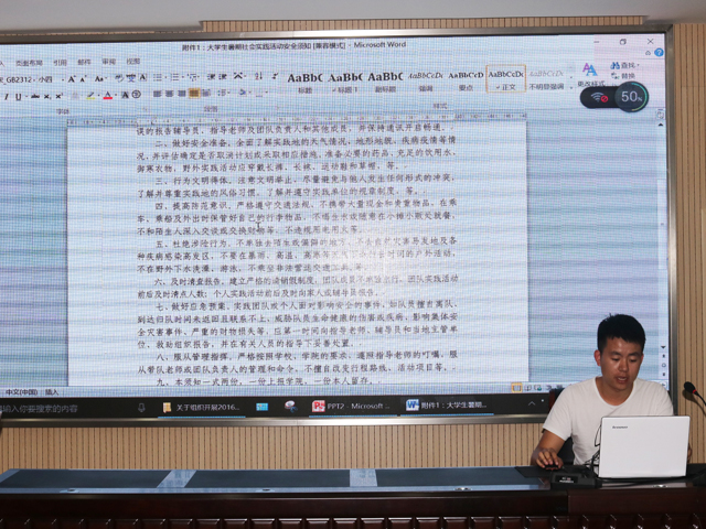 培训会上,韩露瑶首先和大家分享了自己的实践经验,她就调研的前期、过程与后期三个方面向大家提出了许多实用的建议。针对至关重要的团队宣传问题,楚子轩以自身经验为例告诫大家要注重活动照片和宣传稿的质量,同时就团队的管理问题,他提到:优秀、团结是队伍成功的基础,要注重团结协作,实力出成果。他还向大家表达了自己的美好期许,希望今年的团队能够做的更好,将公司的优秀组织奖延续下去。为了使各团队负责人更加了解暑期社会实践的具体情况,院团委组织部司海峰为大家讲解了相关材料的前期准备、报备以及后期收集等方面的内容。