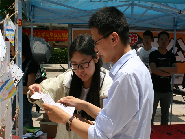 解忧信笺,打开心灵之窗。工作人员在活动前期面向安师大全体员工收集到500封倾诉信并由2015级社会工作专业同学就其困扰给出中肯答复。活动当天设置四个展架,并将信封挂到展架上供参与写信倾诉的同学根据来信昵称查看给予的回复。同学们拆开自己的信封后,一行行红色的贴心回复犹如一颗颗炙热的爱心将两个素不相识的陌生人联系到一起,共同分享人生的酸甜苦辣。