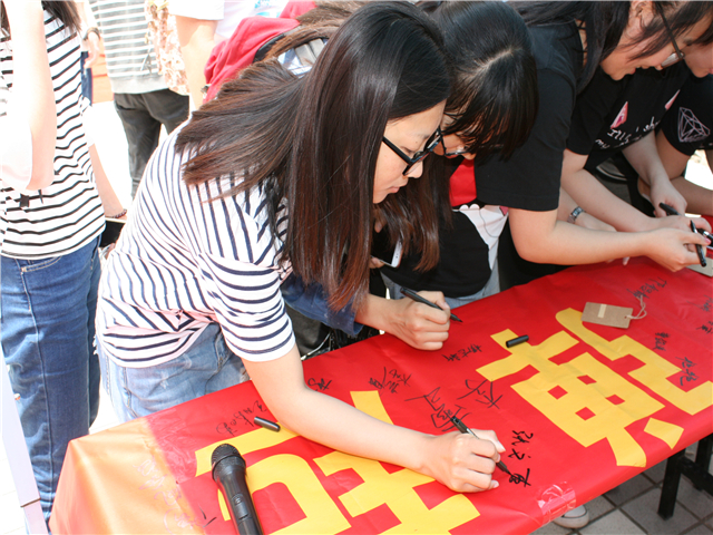 心语心愿,拥抱幸福未来。工作人员给每位参加此次活动的同学发放许愿牌。大家纷纷写下自己心中的愿望并将许愿牌挂在宣传展架上,最后在横幅上郑重地签下自己的姓名并合影留念。