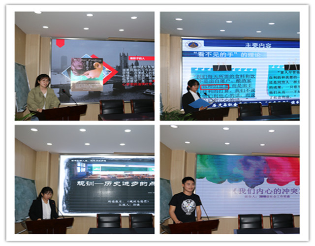 本次报告会共计13名选手参加,选手们各具特色,落落大方。15级公共事业管理专业的巩星利从专业出发,结合所学知识与读书心得,对《国富论》一书进行自我分析,内容条理明晰,观点有理有据;16级公共事业管理专业的裴晨哲与同学们分享了自己对于《纳兰词》一书的见解与感受,同时为同学们展示了自己撰写的诗词,充分体现了“腹有诗书气自华”的气概;16级社会学专业的严佳更是从自身体会和现实条件等多方面详细介绍了《乌合之众》一书,告诫大家要有效衡量现实情况,不能盲目从众。