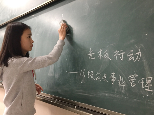 为了保持教室黑板的洁净,3月20日下午,16公管班在行知楼1号楼5楼的教室开展了光板行动,班长曹宁将同学们分成了6个小组,为每个小组分配了任务。同学们相互配合,用抹布将黑板清洁干净后,又将讲台和板槽等卫生死角打扫干净,所有的黑板都变得干净明亮,不仅为同学们提供了一个整洁舒适的学习环境,还弘扬了雷锋精神,传递了校园正能量。