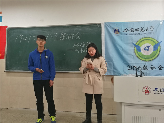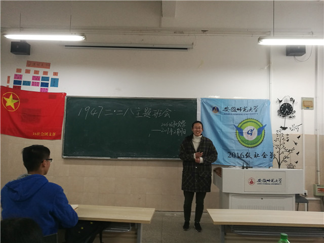 本网讯(2016级社会学 严佳)历史是一面镜子,它照亮现实,也照亮未来!今年是1947二·二八事件70周年纪念日,为了时刻敲响历史警钟,表达同学们的爱国情怀。2月27日下午,2016级社会班在2040101A教室召开主题班会,此次班会由团支书潘嫣然主持,16社会学全体同学参加。