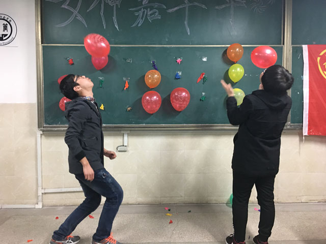 晚上7点,主题活动在一首暖心的歌曲中拉开帷幕。班长曹宁首先鼓动在场的每一位女生写下自己的一个小愿望,并把愿望纸条放进气球里,让男生们随机戳破气球来实现女生们的愿望,女生们一时脑洞大开,纸条上的愿望也是眼花缭乱,譬如“让任意两名男生十指相扣的同时还要深情对视”,再如“指定一名男生上台表演卡通人物”等等,稀奇古怪的小小愿望承载着女生们青春岁月里的大大梦想。每位女生的成长历程中都需要许多人的陪伴与鼓励,校园则是她们心灵里最温暖的慰藉。活动最后,班长曹宁带领大家进行了一场“吹气球”比赛,在比赛中增进了同学们之间的感情,同时也在欢声笑语中,本次活动拉下了帷幕。