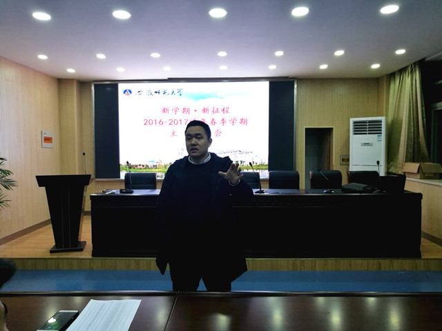 首先,辅导员周贤超老师告诉大家要做到以饱满的精神状态去迎接新学期的第一节课。随后,周老师再次提醒期末考试没有通过的个别同学要关注好重考重修的消息,避免影响学业。然后,周老师提醒大家,由于转专业造成的人才流失,班委、团委以及员工会会有新的一轮补招计划,他鼓励曾经想要站上竞选讲台却因为各种原因没有上台的同学要抓住这次机会,为自己争取平台施展才华与能力。最后,周老师告诉大家要给自己的2017年定一个目标,要寻找到自己在新的一年里的关键词,并为之而努力奋斗。班会在一片掌声中圆满结束。