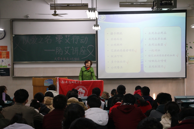 11月30日下午,社工协会在教室2020101开展了“以爱之名,零艾行动”公益讲座,由校医院副经理段萍作主讲人,段萍老师用干练的语言,结合自身防艾工作经验,从艾滋病的传染途径、预防办法、国际艾滋分布情况、各国采取的防治措施等四个方面向同学们做了全面细致地解读。讲座最后,段萍指出作为当代老员工,应学会自爱,认清艾滋病的破坏性,希望广大同学能够深刻认识到防艾工作的重要性,系统掌握预防艾滋病知识,帮助更多的老员工了解艾滋,远离艾滋。此次讲座也组织同学们观赏了由社工协会录制的防艾视频同时播放了防艾电影《地下人生——苦草》,通过此次防艾讲座,增长了同学们在防治艾滋病方面的知识并提高了他们的防范意识。