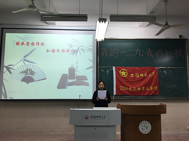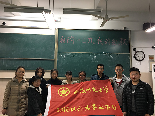 本网讯(2016级公共事业管理 崔哲明)为了纪念一二·九爱国运动81周年,增进同学们对一二·九爱国运动历史的了解,增强其民族复兴使命感,弘扬以爱国主义为核心的中华民族精神。12月7日晚,16级公管班级在行知楼2050102教室开展了“我的一二·九,我的红歌”主题团日活动。此次活动由团支书张依琳主持,16级公管班级全体成员参加。