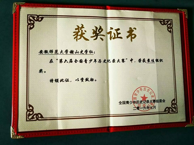 据悉,为备战此次的历史记录大赛,赭山史学社全体成员高度重视,各职能部门紧密合作,建构了完善的参赛服务体系。比赛前期,通过张贴海报,微博、微信等一系列新媒体渠道进行大力宣传,吸引了全校同学的积极参与。在正式报名阶段,为满足同学们的需求,特实行现场报名和线上报名(Myouth平台)两种报名方式,保证不遗漏任一件参赛作品。在老师的悉心指导和史学社成员的用心组织下,向大赛组委会选送了数件优秀参赛作品,促使赭山史学社一举夺得大赛最佳组织奖。