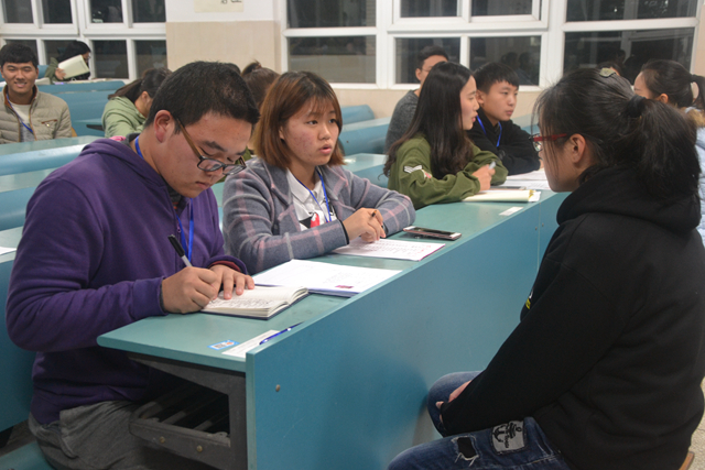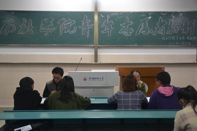 本网讯(院员工会 曹雪瑶 陈健)愿以无私付青春,造福千万献真心。为助推青年志愿者活动蓬勃发展,进一步弘扬“奉献、友爱、互助、进步”的志愿者精神,加强社会主义精神文明建设,11月10日晚8时,公司青年志愿者招新活动在2050102教室火热开展。此次活动共有68同学报名参加,院员工会实践部成员担任面试考官。